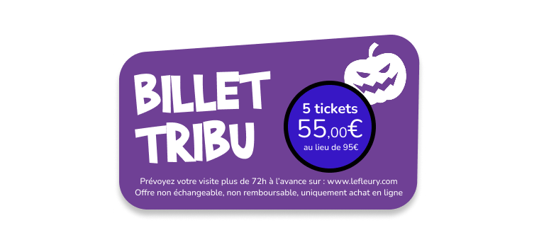 nos offres 2025 Spécial Halloween Journées classiques BILLET TRIBU (Uniquement sur internet, non cumulable avec d'autres offres en cours) Bénéficiez d’un tarif préférentiel pour l’achat de 5 tickets (dates identiques), si vous prévoyez votre visite plus de 72heures à l’avance !+1m20 : 55€ pour l’achat de 5 tickets (billets datés – dates identiques – hors événement nocturne) BILLET MALIN (Uniquement sur internet) Bénéficiez d’un tarif préférentielsi vous prévoyez votre visite plus de 72heures à l’avance !Entre 90cm et 1m20 : 14 €Plus d’1m20 : 17 € BILLET LIBERTÉ (Uniquement sur internet) Valable le jour de votre choix durant toute la saison, et cela à un tarif préférentiel ! (Billets valables à partir du lendemain de l’achat)Entre 90cm et 1m20 : 15 €Plus d’1m20 : 18,50 € BILLET CLASSIQUE (à acheter sur place, le jour de votre venue) Ce billet vous offre un accès au parc le jour de votre visite.– 90 cm : GratuitPlus d’1m20 : 19 €Entre 90cm et 1m20 : 15 €Femme enceinte / Plus de 65 ans : 14 €PMR : 12,90 € PASS SAISON 2025 Visitez le parc Le Fleury en illimité pendant toute la saison ! + de 65 ans 48€ + d'1m20 60€ + de 0,90m et - de 1m20 48 € Entrée gratuite pour les moins de 90 cm Le parc n’accepte pas les chèques FERMETURE DES CAISSES 1H AVANT LA FERMETURE DU PARC FERMETURE DES ATTRACTIONS 30 MIN AVANT LA FERMETURE DU PARC Je réserve mes billets